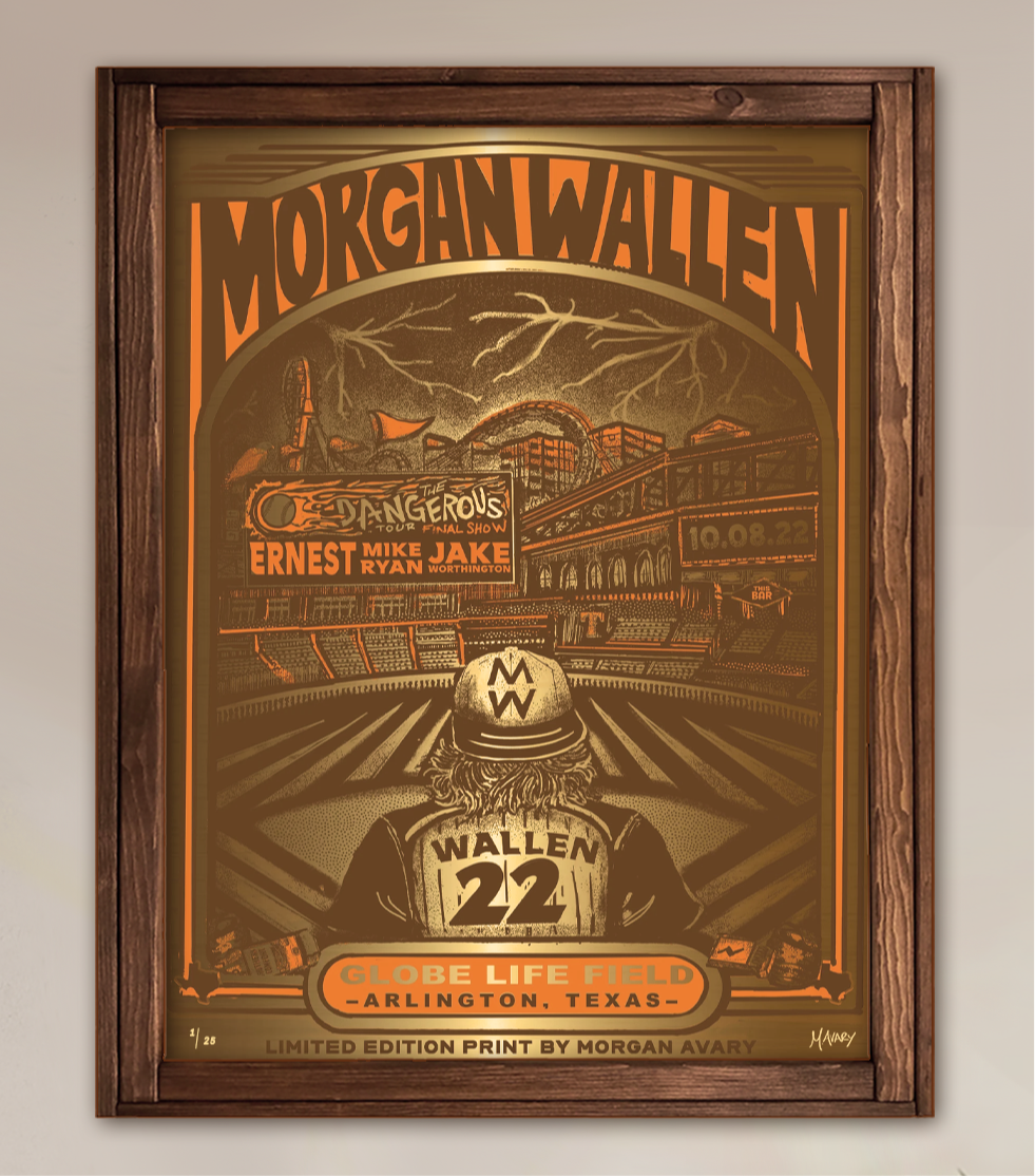Artist Proof - Official Poster for Morgan Wallen’s show at Globe Life Field in Arlington, TX on October 8, 2022 with support from Ernest, Jake Worthington and Mike Ryan. This commemorative print was a big memory for the MW team and set a record for audience members there for a performance as this was the final show of “The Dangerous Tour”